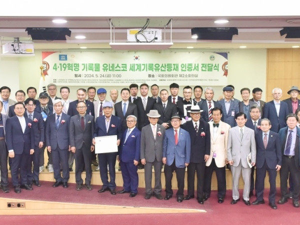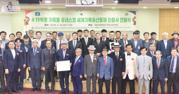 (사)4·19혁명UN유네스코세계기록유산등재 및 기념사업추진위원회는 24일 오전 11시 국회의원회관 제2소회의실에서 4·19혁명 기록물 유네스코세계기록유산등재 인증서 전달식을 개최했다.
