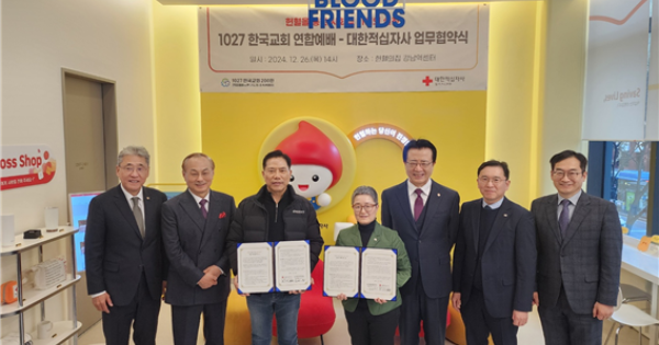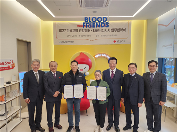 1027 한국교회 연합예배 및 큰 기도회 조직위원회(이하 한국교회)는 대한적십자사 혈액관리본부와 26일 오후 2시 헌혈의집 강남역센터에서 생명나눔 헌혈문화 확산을 위한 업무협약을 체결했다고 밝혔다.