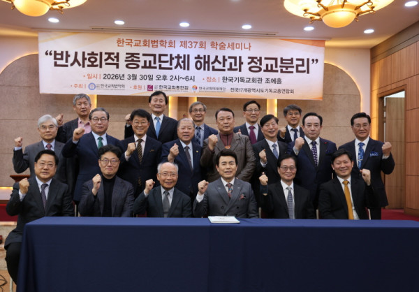 한국교회법학회(이사장 소강석 목사, 학회장 서헌제 교수)는 지난 30일 서울 종로구 한국기독교회관 2층 조에홀에서 ‘반사회적 종교단체 해산과 정교분리’를 주제로 제37회 학술세미나를 개최했다. 이번 세미나는 한국교회총연합, 한국교회미래재단, 전국17개광역시도기독교총연합회가 후원했으며, 최근 국회에 발의된 ‘정교유착 방지법안(민법 일부개정안)’을 둘러싼 논란 속에서 법적·신학적 대안을 모색하기 위해 마련됐다.