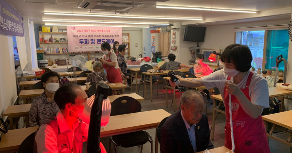 국제구호개발 NGO ㈔월드뷰티핸즈(WBH, 이사장 장헌일)는 22일 마포구(청장 박강수)와 공동으로 2022 마포구 관내 독거어르신 우울증 감소를 위한 두피 및 핸드케어 뷰티서비스를 대흥동 해돋는마을 엘드림노인대학에서 행사를 진행했다.