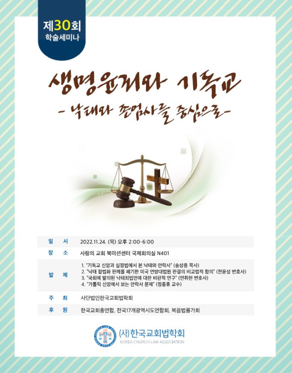 한국교회법학회(이사장 소강석 목사, 학회장 서헌제 교수)는 오는 24일 오후 2시 서울 사랑의교회 4층 국제회의실에서 “낙태와 존엄사를 중심으로 한 생명윤리와 기독교”라는 주제로 제30회 학술세미나를 개최한다.