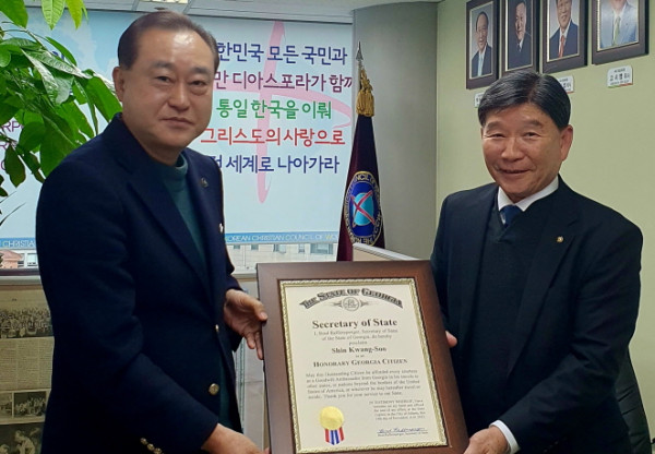 특히 이날 임원회 후 위촉식을 통해 대표회장 신화석 목사와 사무총장 신광수 목사가 ‘미국 조지아주 명예시민’이 됐다.