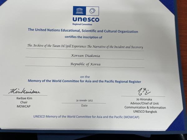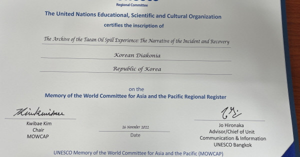 특별히 지난 11월 26일에는 한국교회의 연합과 섬김의 정신이 녹아있는 태안 유류피해극복기록물이 삼국유사, 내방가사와 함께 유네스코 세계기록유산(Memory of the World) 아시아태평양 지역목록으로 최종 등재되었다.
