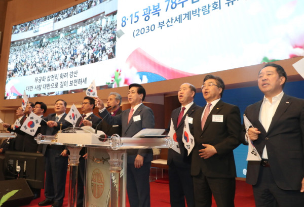 한국교회총연합(이하 한교총)이 13일 17시 여의도순복음교회에서 8.15 광복 78주년 한국교회 기념예배를 가졌다. ‘2030 부산세계박람회 유치 기원대회’를 겸하여 진행된 이 예배는 이순창 목사(예장통합 총회장)의 사회로 이철 감독(기감 감독회장)이 설교를, 한교총 회원 교단 총회장들이 참석하여 성명서 낭독과 돌림 기도 등의 순서를 맡았으며, 한기총 회장 정서영 목사가 초대되어 축도했다.