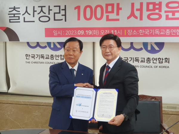 한국기독교총연합회(대표회장 정서영 목사)와 한국사회발전연구원(이사장 김요셉 목사)은 19일(화) 오전 한기총 회의실에서 ‘출산장려 100만 서명운동 협약식’(대한민국과 한국교회를 살리기 위한 범국민출산지원운동)을 갖고 상호교류 협력에 관한 협정서를 체결했다.