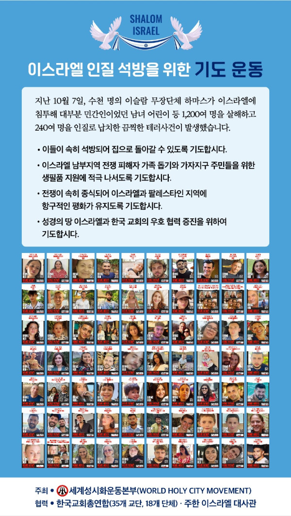 세계성시화운동본부(대표회장 김상복 목사, 전용태 장로)는 28일 팔레스타인 가자지구 이슬람 무장단체 하마스에 잡혀간 인질들의 석방과 이스라엘과 팔레스타인 지역의 항구적 평화를 위한 기도 캠페인을 시작했다. 캠페인에는 한국교회총연합(35개 교단, 18개 단체)가 주한 이스라엘 대사관이 협력하고 있다.