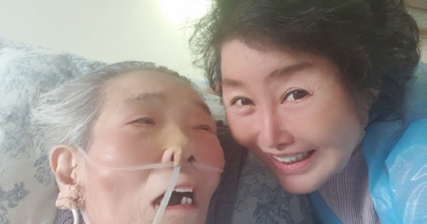 간병은 선교사역이다. 천국소망이 있어 웃어요. 한지혜 이사장과 환자분이 환하게 웃고 있다.