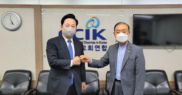 더불어민주당 김두관 의원이 지난 6월 4일(금) 오후 한국교회연합을 예방해 대표회장 송태섭 목사와 환담을 나누었다.