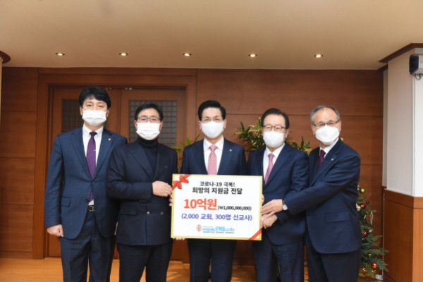 여의도순복음교회는 5일 코로나19로 교회 운영에 어려움을 겪고 있는 기독교대한하나님의성회(기하성) 소속 농어촌 미자립교회 2000곳과 해외 선교지 교회 300곳에 ‘희망의 지원금’ 10억 원을 전달했다.
