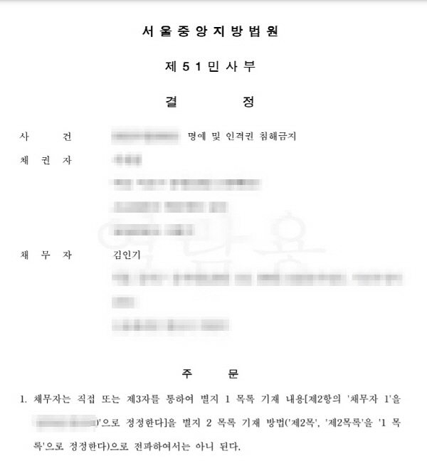 ‘명예 및 인격권 침해금지’ 가처분 결과, 법원 전파행위 금지