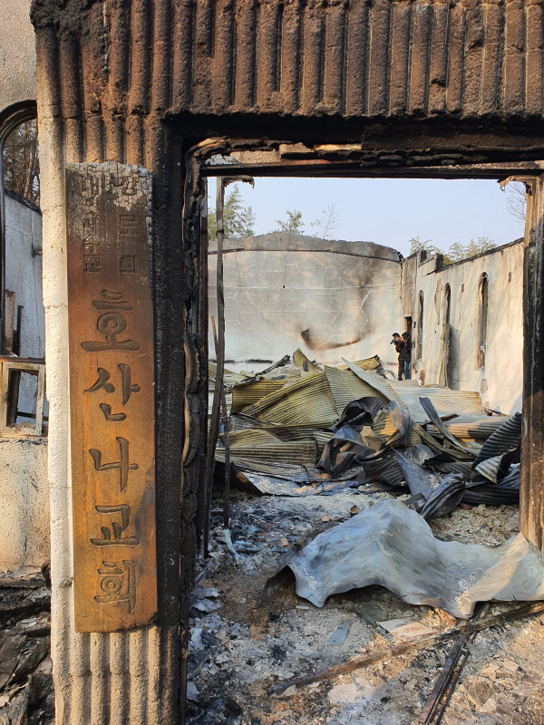 한국교회봉사단(한교봉) 김삼환 목사(총재), 오정현 목사(이사장), 김태영 목사(대표단장) 등 임원단은 9일 경북 울진 산불피해 교회와 이재민 가정을 방문하여 위로했다. 이날 함께한 울진군기독교연합회(회장 이승환 목사)는 연합회 소속 85개 교회 중 2곳과 성도들 가정 30곳이 산불로 전소됐다고 전했다.