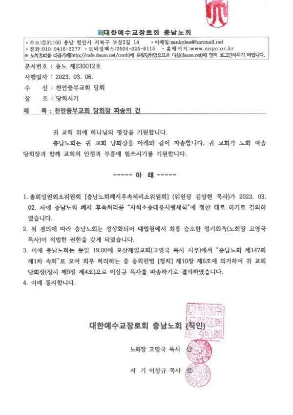 이러한 법원의 판결이 있었음에도 또 다시 천안중부교회에 이상규 목사를 당회장이라고 불법 공문을 내려 보낸 것이다.