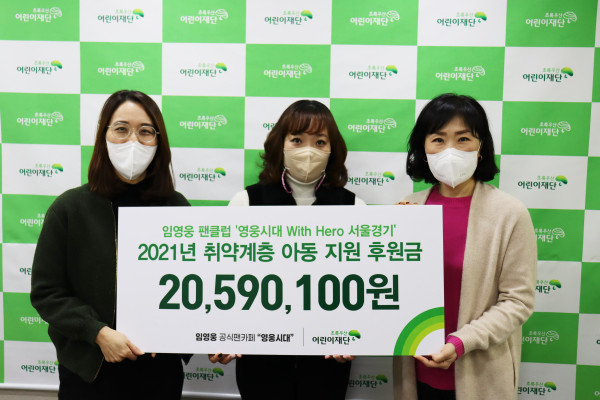‘영웅시대 With Hero(서울,경기)’ 관계자는 “가수 임영웅의 선한 마음처럼 팬클럽 회원들도 마음을 모아 선한 영향력을 펼치고 싶었다”면서 “지속되는 코로나19 상황 속에서 아이들의 삶이 조금이나마 나아지길 바란다”며 기부 소감을 밝혔다.