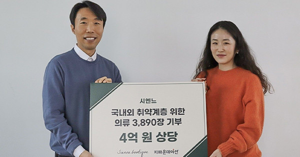 국제개발협력NGO 지파운데이션(대표 박충관)은 주식회사 시엔느(대표 박초은, 전상호)가 국내외 취약계층 지원을 위해 4억 원 상당의 의류와 잡화 3,890점을 기부했다고 밝혔다.
