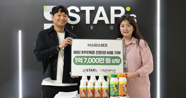 국제개발협력NGO 지파운데이션(대표 박충관)은 ㈜스타스테크(대표 양승찬)로부터 해외 농산물 재배 강화를 위해 1억 7,000만 원 상당의 액상비료를 기부 받았다고 6일 밝혔다.