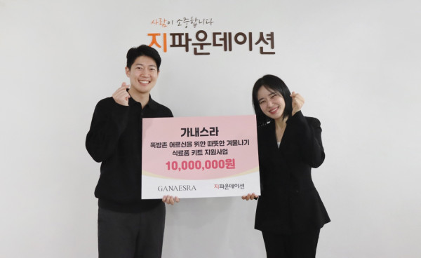지파운데이션(대표 박충관)은 ㈜가내스라(대표 정슬아)가 쪽방촌 어르신들이 따뜻한 겨울을 보낼 수 있도록 후원금 1,000만 원을 지파운데이션에 전달했다고 23일 밝혔다.