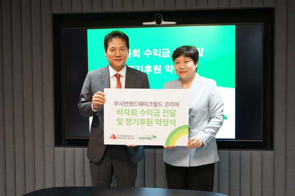 초록우산어린이재단(회장 황영기)은 글로벌부동산컨설팅사인 쿠시먼앤드웨이크필드 한국지사(이하 쿠시먼 코리아)와 6월 28일(목) 서울시 중구 세종로에 있는 쿠시먼 코리아 19층에서 정기후원 약정식을 진행했다고 밝혔다. 이번 후원은 쿠시먼 코리아에서 지난 9일(금) 진행한 자선 바자회 수익금과 임직원들이 직접 참여하는 정기후원을 통해 마련됐다.