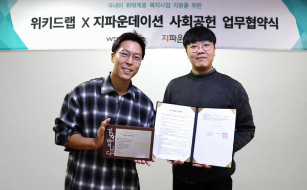 지파운데이션과 위키드랩은 ‘국내외 취약계층 복지사업 지원을 위한 사회공헌 업무협약식’을 갖고 나눔 파트너로서 사회공헌활동을 지속해 나갈 수 있는 협력 방안을 도모하였다. 위키드랩은 물품 기부를 통해 소외된 이웃들이 행복한 삶을 영위할 수 있도록 사회적 책임을 다하고, 국내외 취약계층을 돕기 위한 다양한 나눔에 적극 참여할 예정이다.
