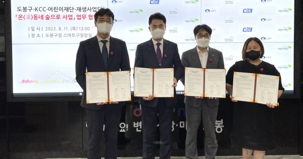 초록우산어린이재단(회장 황영기)은 도봉구(구청장 오언석), KCC(대표 정몽진), 저층주거지 재생사업단(단장 인향봉)과 함께 11일 서울시 도봉구청에서 ‘온(溫)동네 숲으로’ 업무 협약을 맺고 저층주거지 환경개선사업을 5년째 이어간다고 16일 밝혔다.