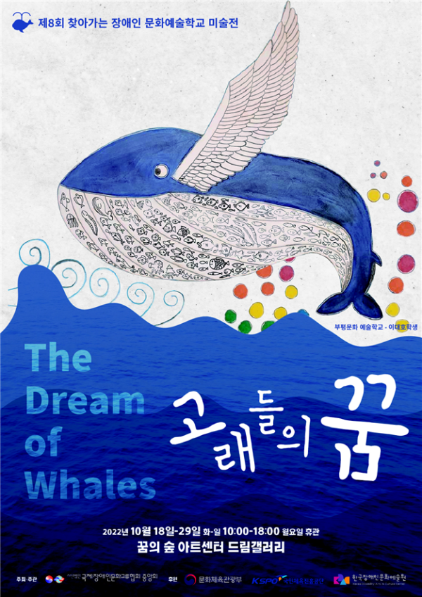 사단법인 국제장애인문화교류협회중앙회(이하 국장협, 이사장 최공열)은 10월 18일부터 29일까지 북서울 꿈의숲 아트센터 드림갤러리에서 발달장애 예술인들의 전시 ‘제8회 찾아가는장애인문화예술학교 미술전 고래들의 꿈’을 개최했다. 이번 전시회는 국장협이 주최하고 문화체육관광부와 국민체육진흥공단, 한국장애인문화예술원이 후원한다.