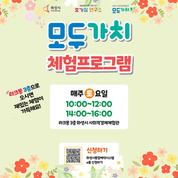 이번 프로그램은 화성시 내 사회적경제기업 중 8개 기업이 선정돼 진행하는 체험프로그램으로 사회적 경제의 의미를 시민들에게 알리기 위해 화성시가 주최하고 화성시사회적경제지원센터, 호기심연구소협동조합 주관으로 진행된다.