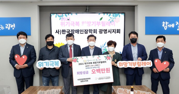 사)한국장애인장학회 광명시지회(지회장 강경남)는 4일 희망성금 500만원을 광명시사회복지협의회(회장 이상재)-광명희망나기운동본부에 전달하였다.