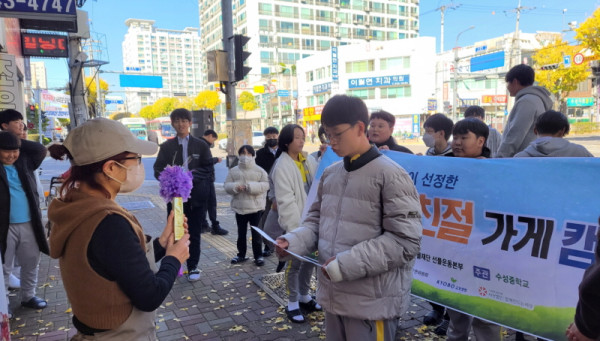 경기 수원의 수성중학교(교장 엄정회)의 선플누리단 학생들이 지역사회와 연계하여 친절한 가게를 발굴하는 '선플친절가게' 캠페인을 성공적으로 수행했다고 29일 밝혔다.