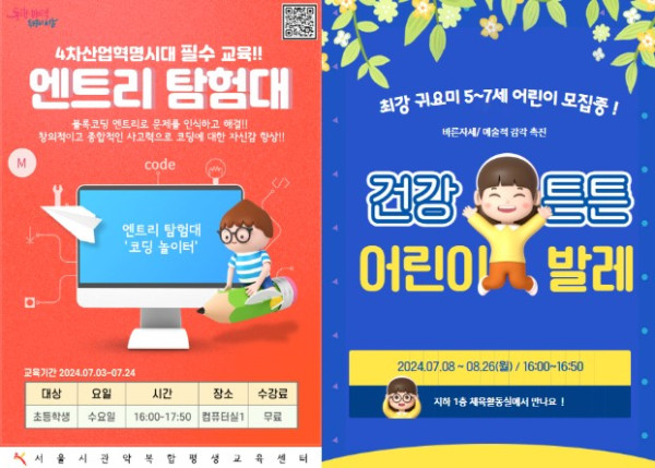 서울시 관악복합평생교육센터(이하, 센터)는 서울시 관악구 낙성대로 70에 위치한 평생학습의 열린배움터로서 서울시민의 공공복리 증진을 위한 다양한 평생교육 프로그램을 운영하고 있다. 7월 초등 대상 엔트리 탐험대 코딩 놀이터, 건강튼튼 어린이 발레 강좌가 열린다.