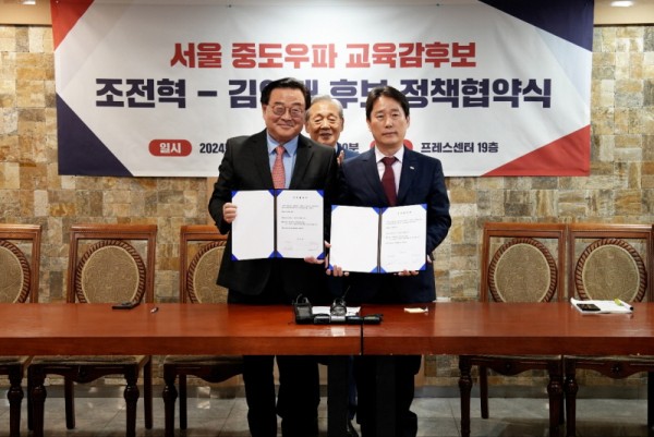 조 후보는 이날 오후 서울 중구 코리아나호텔에서 열린 정책협약식에서 “이제 완벽한 보수 후보 단일화가 완성됐다”라며 “서울교육을 정상화하라는 서울시민의 명령 때문에 단일화가 됐다고 생각한다”라고 밝혔다.