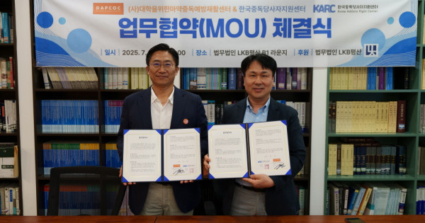 (사)대학을위한마약중독예방재활센터(답콕, 이사장 두상달 장로)는 지난 7월 31일 서울 서초구 소재 LKB 평산 B1 라운지에서 한국중독당사자지원센터와 업무협약을 체결했다. 이번 협약은 법무법인 LKB 평산의 후원으로 마련됐으며, 1부 협약식과 2부 라운지 파티 순으로 진행돼 실질적 협력 의지를 다지는 뜻깊은 자리로 마무리됐다.