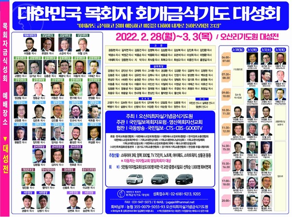 대한민국 목회자 회개금식 기도대성회가 오는 28일일부터 3월 3일까지 오산리기도원 대성전에서 개최된다. 대선을 앞두고 열리는 이번 대성회는 기하성교단을 중심으로 한국교회 목회자들이 한 자리에 모여 금식하며 기도하며, 초교파 목회자 3천여 명이 참석할 것으로 예상된다.
