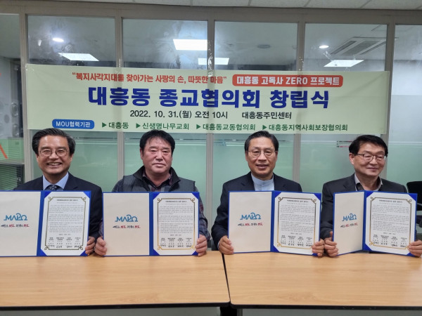 서울특별시(시장 오세훈)가 복지사각지대 발굴 지원을 위해 마포구(구청장 박강수)를 대표하여 선정된 대흥동종교협의회(회장 장헌일 목사,신생명나무교회)가 10월 31일 오전 11시 대흥동주민센터에서 창립식을 가졌다.