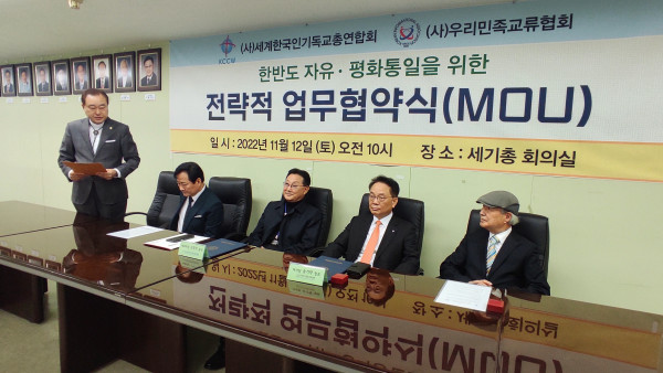 사단법인 세계한국인기독교총연합회(이하 세기총, 대표회장 신화석 목사, 사무총장 신광수 목사)는 12일 오전 10시 서울시 종로구 소재 세기총 회의실에서 한반도 자유·평화통일을 위한 다양한 협력사역을 진행하기 위해 사단법인 우리민족교류협회(이사장 송기학 장로)와의 전략적 업무협약(MOU)을 체결했다.