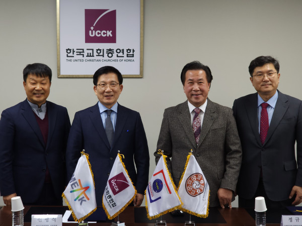 한국교회총연합(이하, 한교총)이 18일 오후 3시 사무실에서 세 곳의 전문 단체와 업무협력을 위한 협약식을 가졌다. 이번에 한교총이 MOU를 체결한 단체는 사단법인 한국기독교군선교연합회(이하 군선교연합회), 사단법인 새희망교화센터(이하 새희망센터), 사단법인 한국기독교문화유산보존협회(이하 한기문)로 교계에서 선교 역량을 발휘하고 있는 전문 사역단체다.