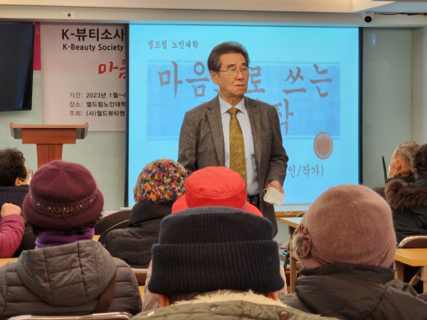 K-뷰티소사이어티연구소(KBSI:소장 최에스더 신한대 교수)는 사회개발NGO (사)월드뷰티핸즈(이사장 장헌일)와 엘드림노인대학 주관으로 국내 최초 쪽방촌과 독거어르신을 대상 시문학강좌를 개설했다.