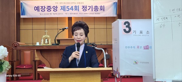 경선으로 관심을 모은 총회장 선거는 이영희 목사가 투표 결과 총 280표 중 237표의 압도적 지지를 얻어 43표에 그친 송순자 목사를 제치고 총회장에 선출됐다.