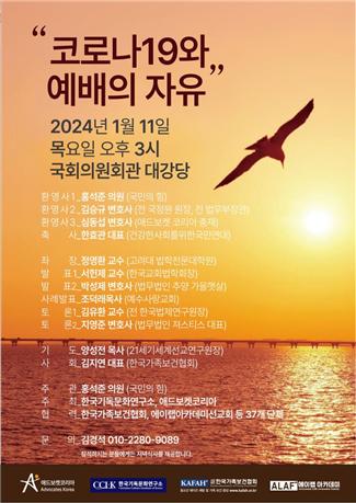 에드보켓코리아는 오는 11일 목요일 오후 3시 국회의원회관 대강당에서 홍석준 국회의원실 주관, 한국기독문화연구소, 애드보켓코리아 공동주최, 한국가족보건협회, 에이랩아카데미선교회 등 37개 단체 협력으로 코로나19와 예배의 자유라는 제목의 포럼이 열린다.