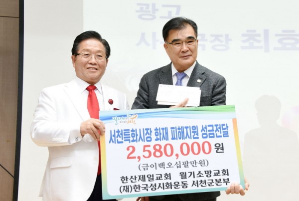 충남 서천성시화운동본부(본부장 정진모 목사)는 20일 오전 6시30분 서천문예의전당에서 ‘제16회 서천군을 위한 조찬기도회’를 개최했다. 또한 정진모 본부장은 화재로 인해 전소가 된 서천특화시장 상인을 돕기 위한 성금 258만원을 김기웅 군수에게 전달했다.