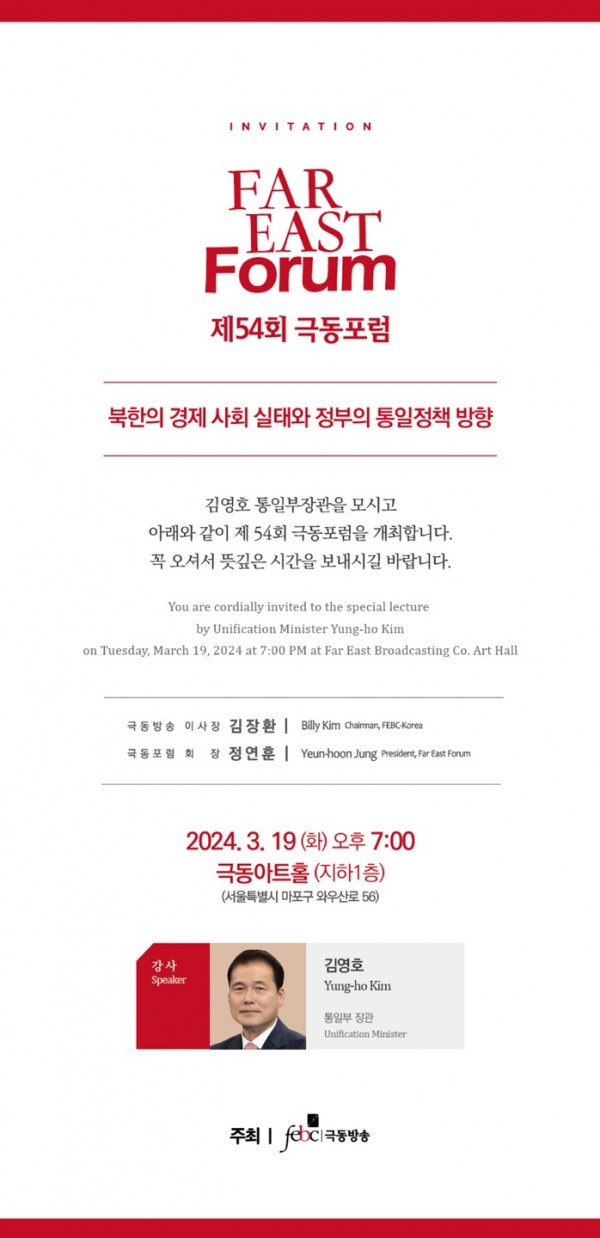 극동방송(이사장 김장환목사)이 주최하는 이날 포럼에서는 김영호 통일부장관을 초청해 북한의 경제 사회 실태와 관련된 최신 정보를 청취하는 시간을 갖는다.
