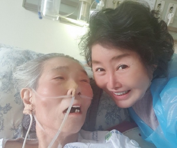 간병은 선교사역이다. 천국소망이 있어 웃어요. 한지혜 이사장과 환자분이 환하게 웃고 있다.