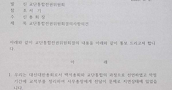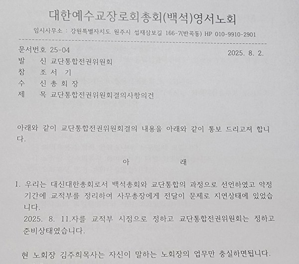 ‘교단통합전권위원회’는 백석총회장 앞으로 공식 공문을 보내 교단통합 과정에서 교적부 정리 지연에 대한 사과와 함께 8월 10일자 기준으로 교적부를 정리해 통합 작업을 완료할 방침임을 전했다.