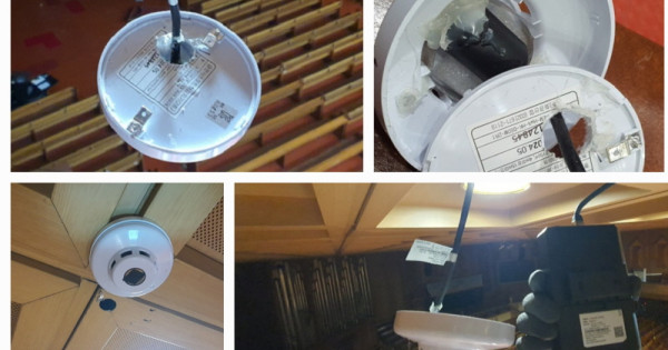 윤 목사에 따르면 지난달 신길 본당 곳곳에서 몰카로 의심되는 CCTV가 여러 대 발견됐다. 이들이 발견한 CCTV는 총 14대로 3층 로비 천장에 2개, 본당 발코니석 위 천장에 4개, 아래 천장에 2개, 그리고 CCTV 주변에 설치된 카메라 6개다. 무엇보다 이중 6대가 화재감지기로 위장된 카메라여서 충격을 주고 있다.
