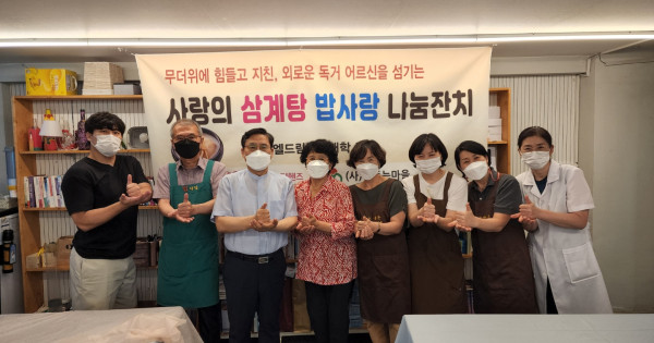 쪽방촌과 독거어르신을 섬기는 (사)해돋는마을(이사장 장헌일 신생명나무교회 목사)는 소셜서비스 전문인 봉사기관(사)월드뷰티핸즈(회장 최에스더 신한대 뷰티헬스학과 교수)과 함께 27일 엘드림노인대학 강당에서 독거어르신 삼계탕 나눔잔치를 갖고 쪽방촌과 독거 어르신, 거동이 불가능한 어르신께 사랑의 전복삼계탕과 시원한 수박과 참외 등 과일잔치로 섬겼다.
