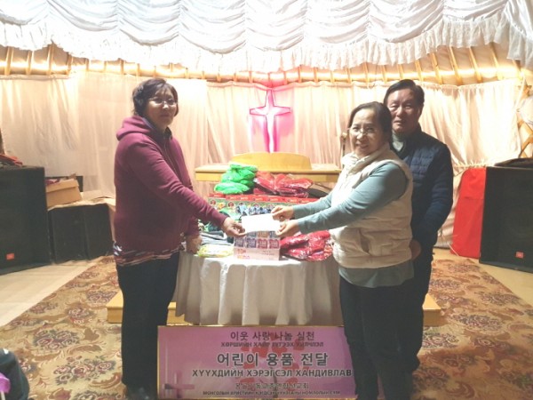 이번 몽골 선교일정 중 이주형 목사는 몽기총을 통해 세워진 가쪼르트 게렐교회 게르성전을 방문하여 문구류와 방한 모자. 장갑 등 어린이 용품과 후원금을 전달했다.