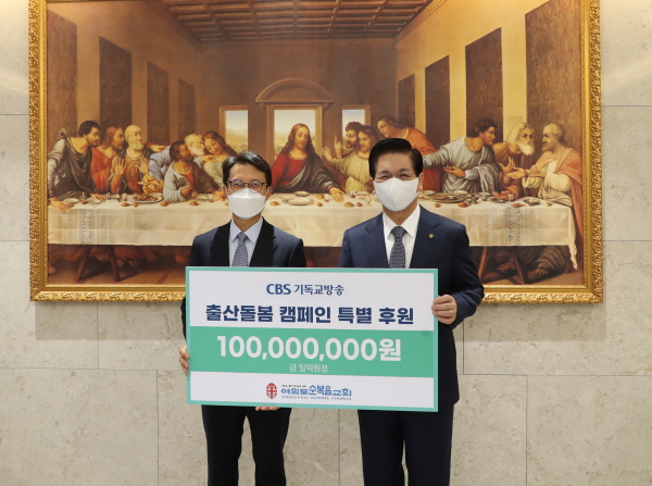 여의도순복음교회는 23일 CBS 출산·돌봄 캠페인 특별후원금 1억 원을 CBS 김진오 사장에게 전달했다. 여의도순복음교회에서 열린 ‘CBS 출산 돌봄 캠페인’ 1주년 기념 감사예배에 앞서 가진 전달식에서 이영훈 목사는 “우리나라 합계출산율이 0.79명이라는 통계청 발표 소식에 대한민국의 미래를 염려하며 교계와 정계 등 모두가 힘을 모아 이 위기를 극복해 내야 한다”고 격려했다.