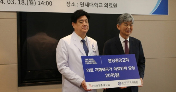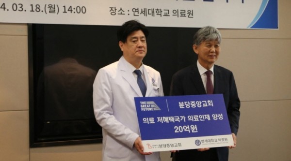 18일 가진 연세대학교 의료원(원장 금기창)과 인류애실천 제3세계 선교국(의료저혜택국가) 의료인재양성 지원 협약에서는 총 20억 원을 기부하기로 했다. 이 협약은 연세의료원 의료선교센터에서 시행하고 있는 해외의료인 연수사업-Avison International Fellowship(AIF), Yonsei Global Health Leadership Course(YGHLC) 등-의 지원을 통해 캄보디아 및 미얀마의 의료인 양성에 기여하고 교회와 의료원 공동의 사회공헌모델 구축을 목적으로 한다.