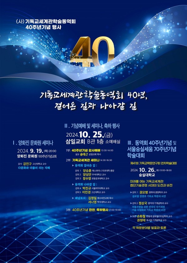 오는 10월25일 삼일교회 B관 1층 소예배실에서 40주년 기념예배 & 기독교세계관 세미나를 개최한다.
