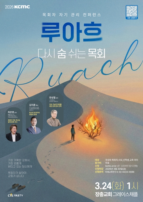 한국교회 목회자들의 목회 역량 강화를 위해 시작한 CTS기독교TV(회장 감경철, 이하 CTS) 대한민국목회컨퍼런스(이하 KCMC)가 「루아흐 : 다시 숨 쉬는 목회」를 주제로 오는 3월 24일 오후 1시, 장충교회(서울 중구 동호로 250)에서 개최한다. KCMC「루아흐 : 다시 숨 쉬는 목회」는 급변하는 목회 환경과 사역의 무게 속에 지친 목회자가 자신을 돌아보고 지속 가능한 목회 기반을 다지도록 돕는 자리다. “목회자가 살아야 교회가 산다”는 취지 아래 목회자의 마음 건강과 관계 관리, 가정 회복을 중심으로 현실적인 적용 방안을 나눌 예정이다.