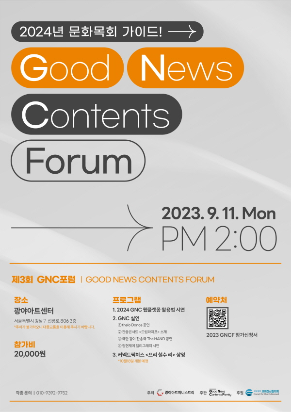 제3회 Good News Contents Forum이(이하 GNC포럼) 2023년 9월 11일(월) 오후 2시 청담동에 위치한 광야아트센터에서 진행된다.