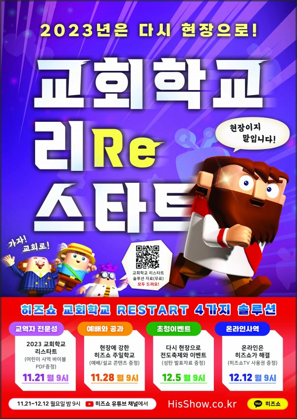 히즈쇼는 11월 21일 저녁 9시에 누구나 시청 가능한 히즈쇼 채널 유튜브 라이브 HNL(다시 보기 가능)을 통해 ”2023 교회학교 리스타트“ 어린이 사역 바이블 PDF를 증정한다고 한다. 그 후 4주간 동일한 시간인 저녁 9시인 11월 28일에는 예배, 설교 콘텐츠 증정, 12월 5일에는 성탄발표자료 증정, 12월 12일에는 히즈쇼TV 사용권을 선별하여 증정한다고 한다. 자세한 일정과 더 궁금하신 사항은 히즈쇼 홈페이지(www.hisshow.co.kr)와 히즈쇼 전화(대표번호: 1644-4129)를 통해 상담 받을 수 있다.